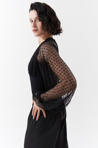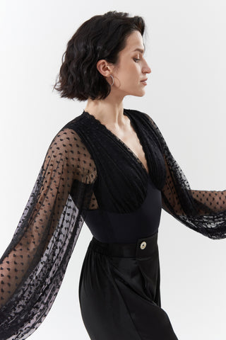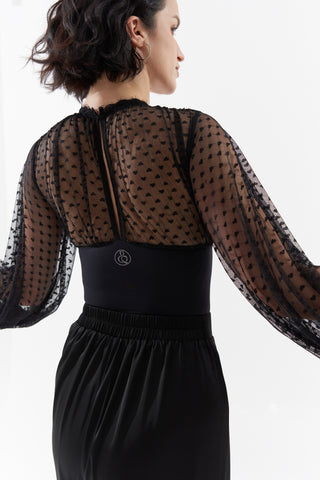 DANCE QUEEN 899-4 Black V Neck Lace Long Sleeve Ballroom Practice Dance Sport Leotard - S