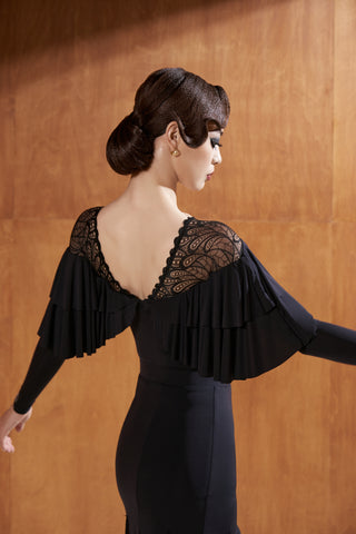 The DANCE QUEEN 863-3 Black V Neck Lace Long Sleeve Leotard exudes refined elegance for the discerning ballroom dancer. Featuring a deep V-neckline and intricate lace sleeves, it perfectly combines allure with sophistication. This design offers a flattering silhouette while ensuring freedom of movement, making it ideal for both rehearsals and performances where grace and style are paramount.