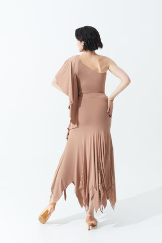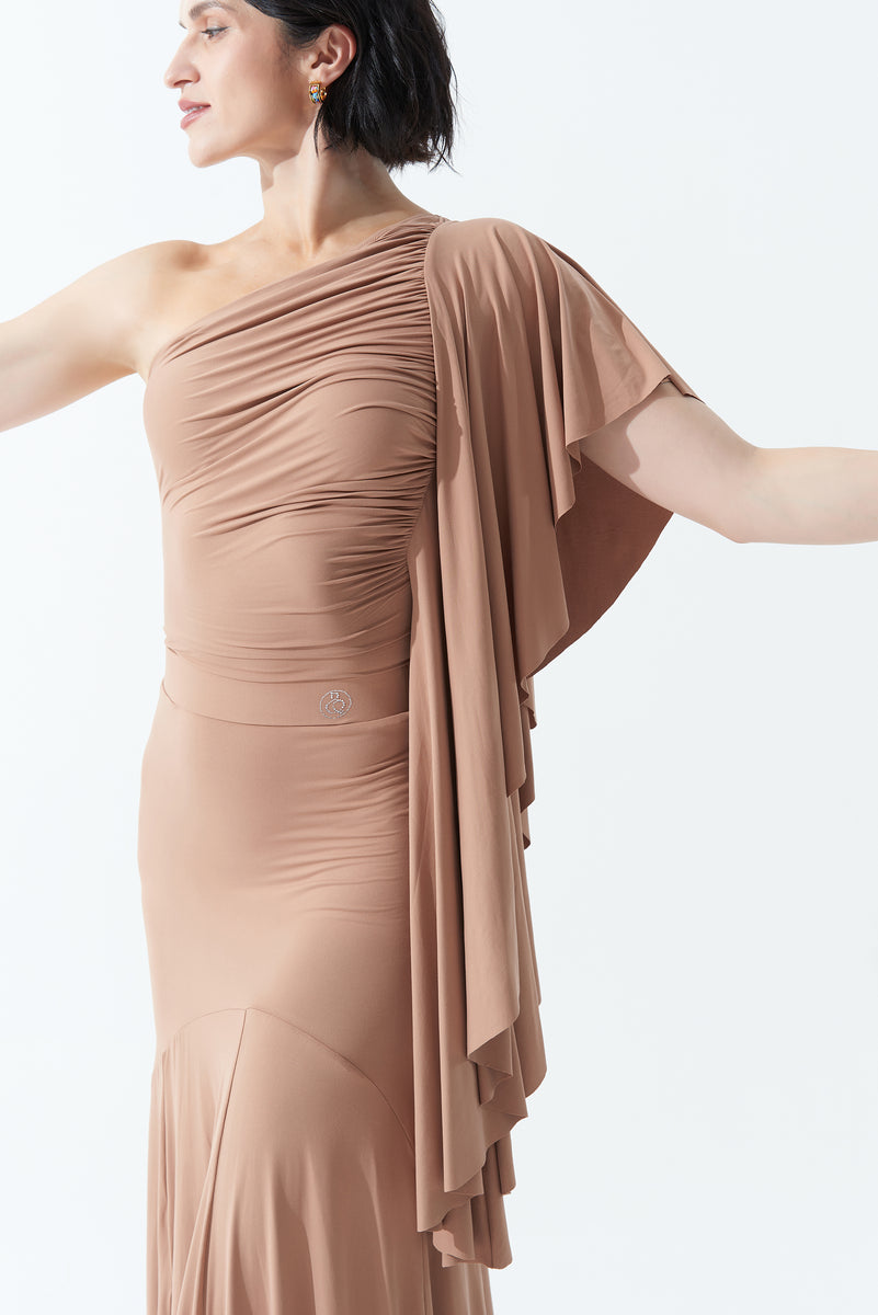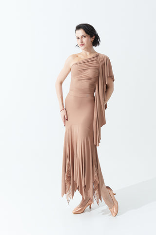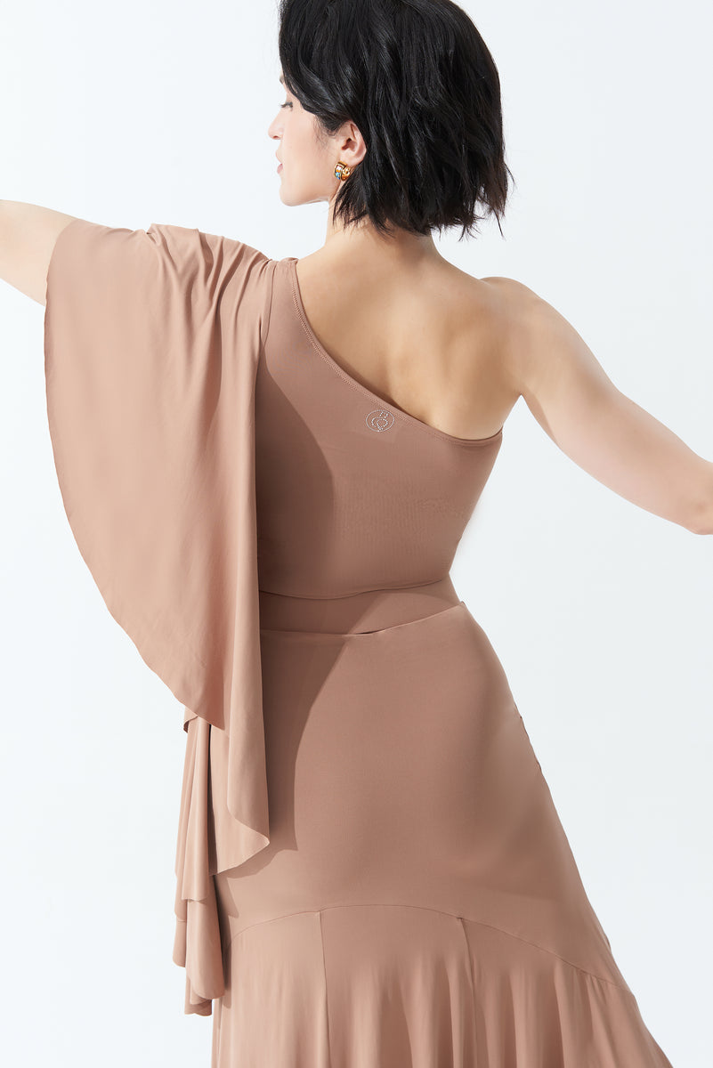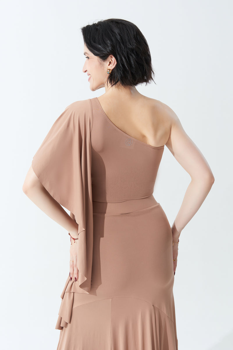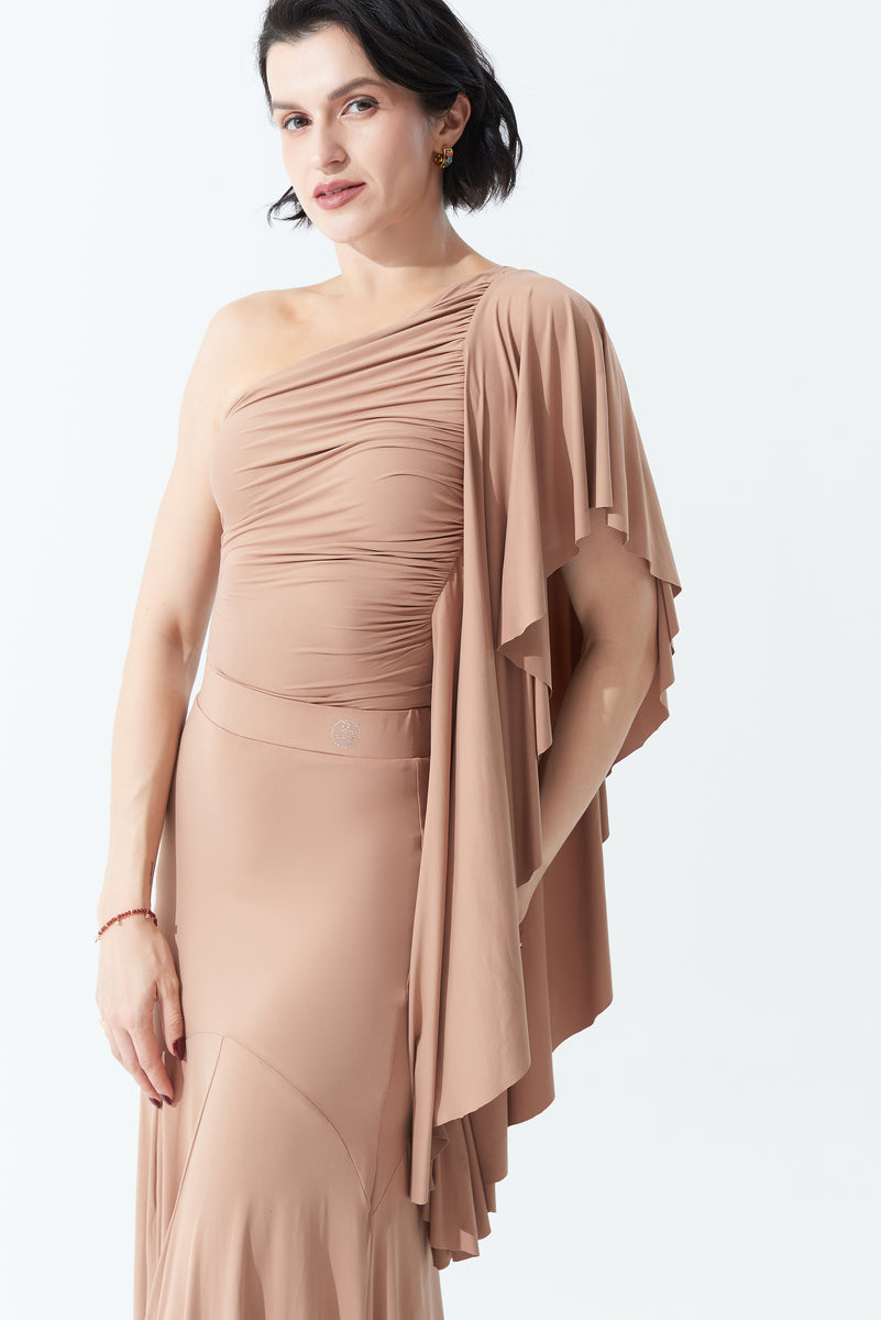 DANCE QUEEN 703-13 Milk Tea Pleated Off Shoulder Practice Dance Sport Ballroom leotard - M