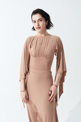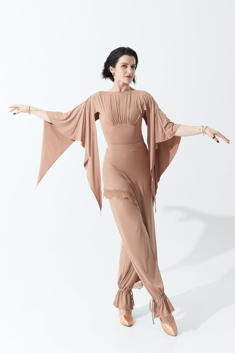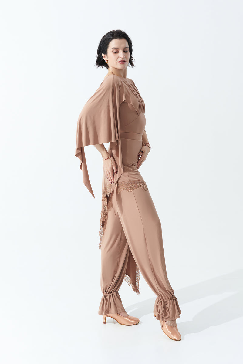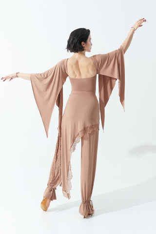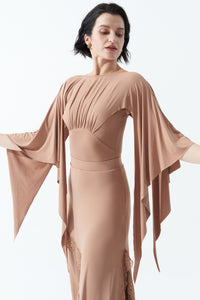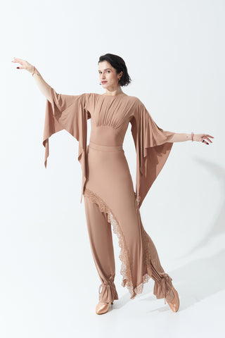 Elevate your ballroom practice with the DANCE QUEEN 723-14 leotard. This stunning milk tea-colored design features a chic one-shoulder cut and dramatic big floats that add movement and flair to every step. The backless silhouette offers freedom of movement while maintaining elegant lines, making it perfect for practice sessions and performances. Crafted for comfort and style, this leotard combines functionality with contemporary dance fashion. Ideal for ballroom dancers seeking a versatile piece that performs as beautifully as you do.