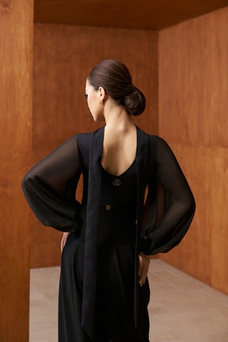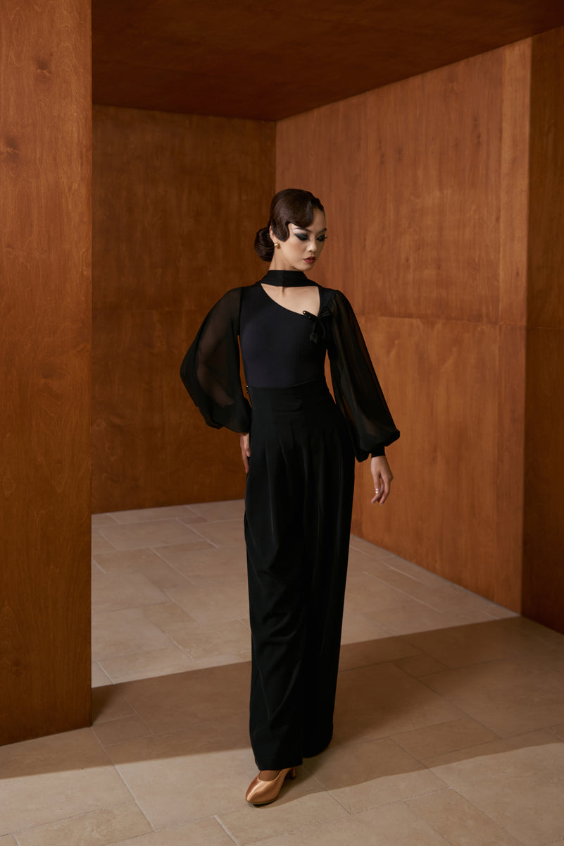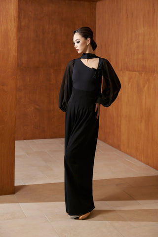 The DANCE QUEEN 808-8 Black Hollow Lantern Sleeve Leotard combines elegance and functionality for ballroom dancers. Crafted with breathable, hollow-design lantern sleeves, it offers both style and ventilation during movement. Its sleek black fabric provides a flattering fit that enhances posture and grace on the dance floor, making it an essential piece for both practice and performance.