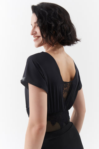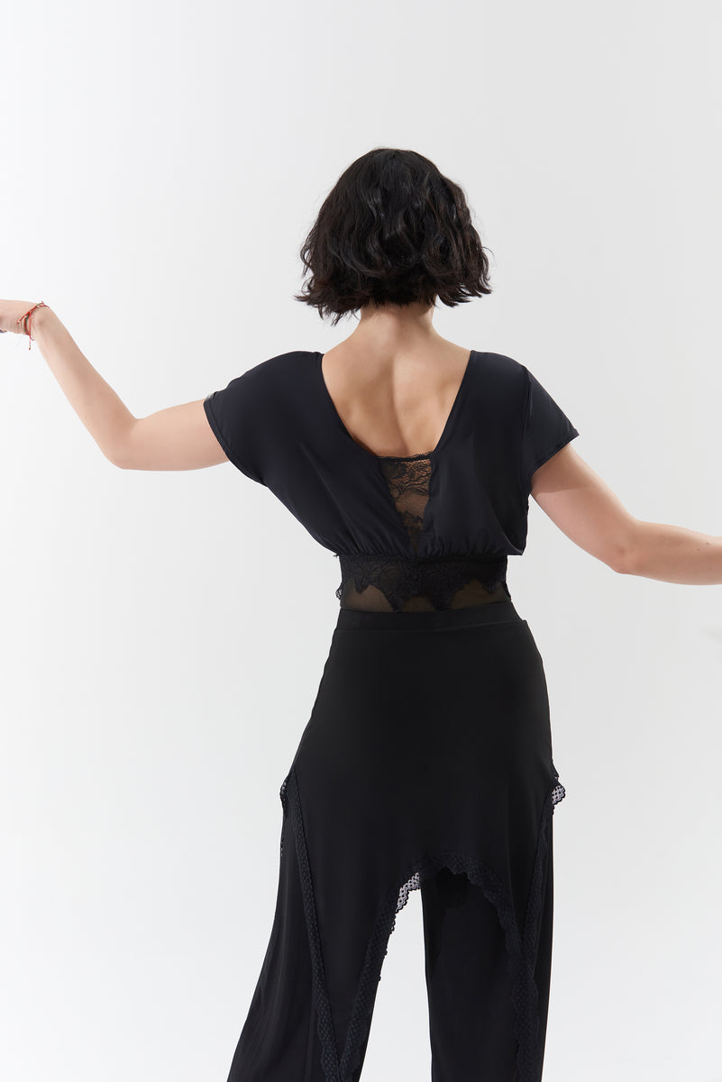 DANCE QUEEN 1104 Black V Neck Short Sleeve Ballroom Practice Dance Sport Leotard - S
