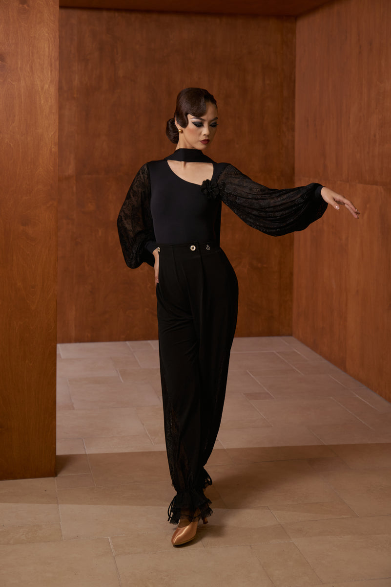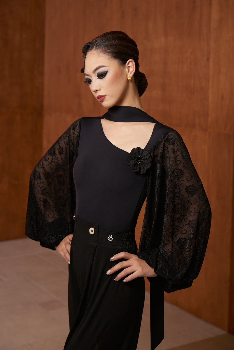 DANCE QUEEN 808-5 Black Hollow Flower Lantern Lace Sleeve Dancing Ballroom Leotard セール