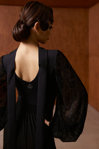 DANCE QUEEN 808-5 Black Hollow Flower Lantern Lace Sleeve Dancing Ballroom Leotard - 2XL