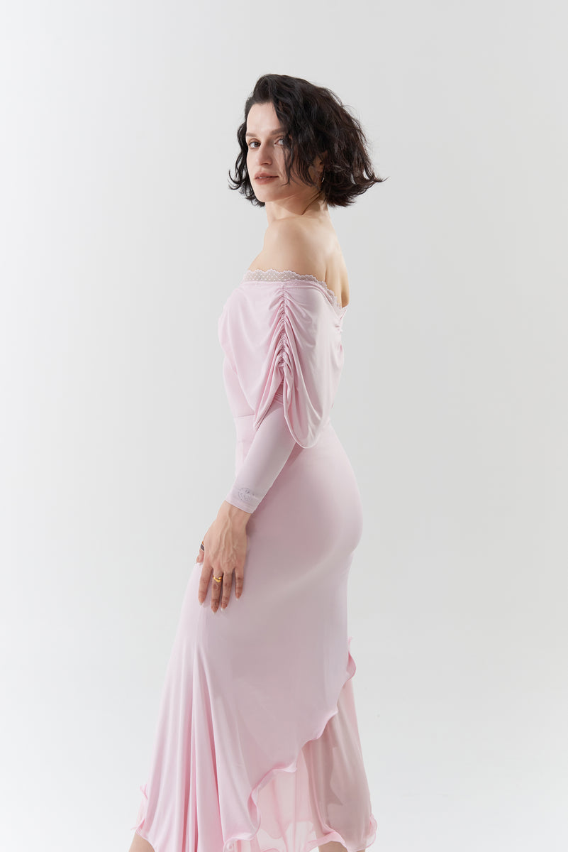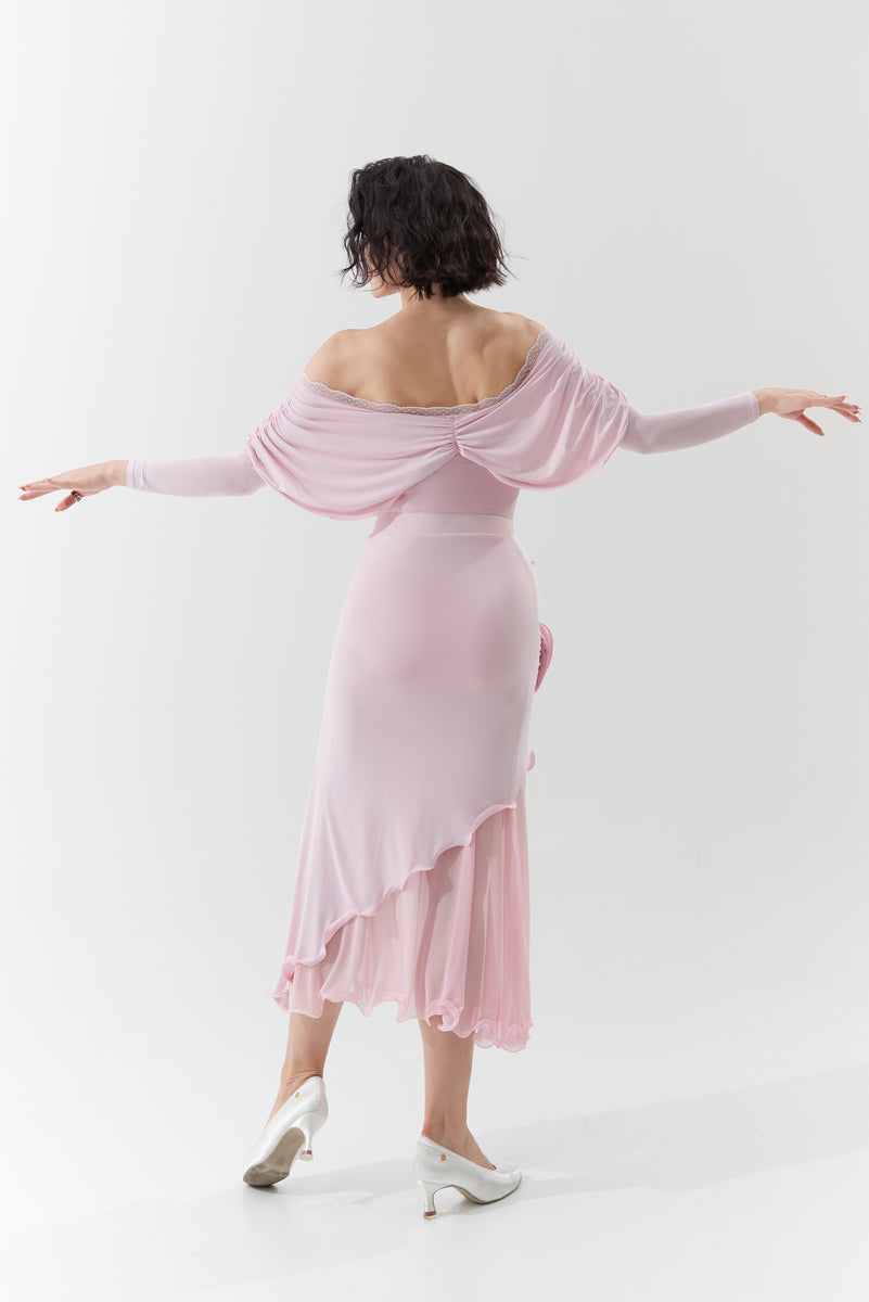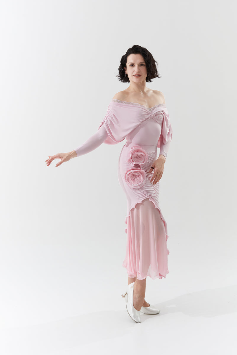 DANCE QUEEN 901-5 Sugar Pink V Neck Lace Puff Sleeve Ballroom Practice Dance Sport Leotard Sale