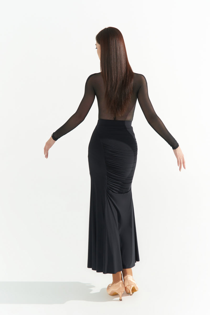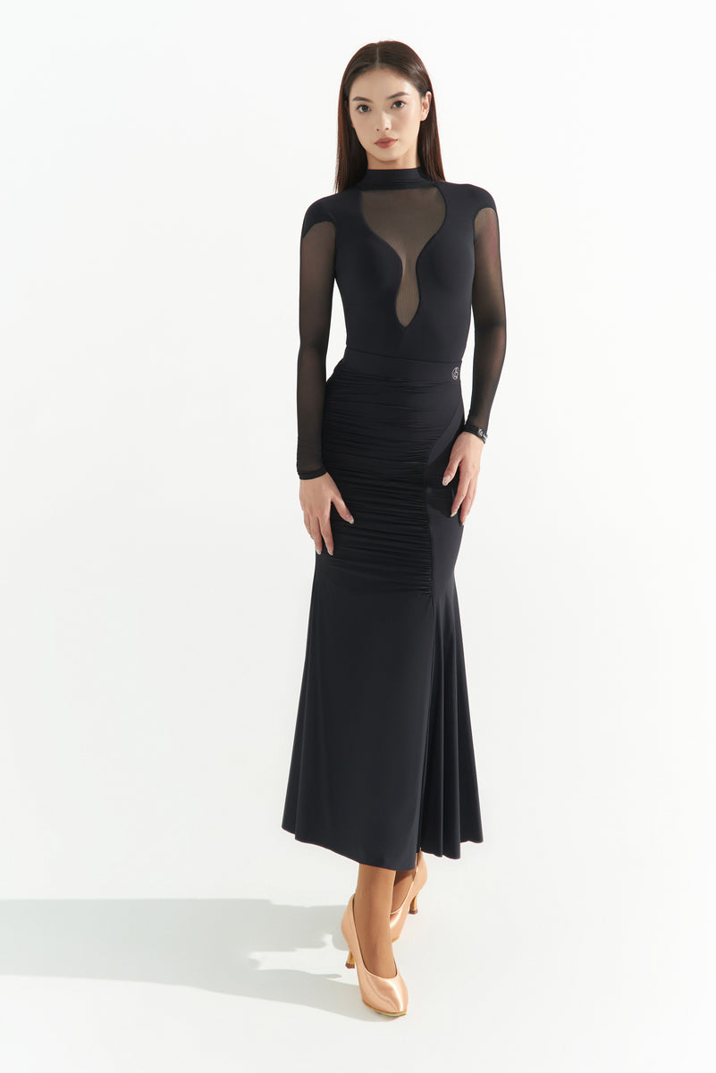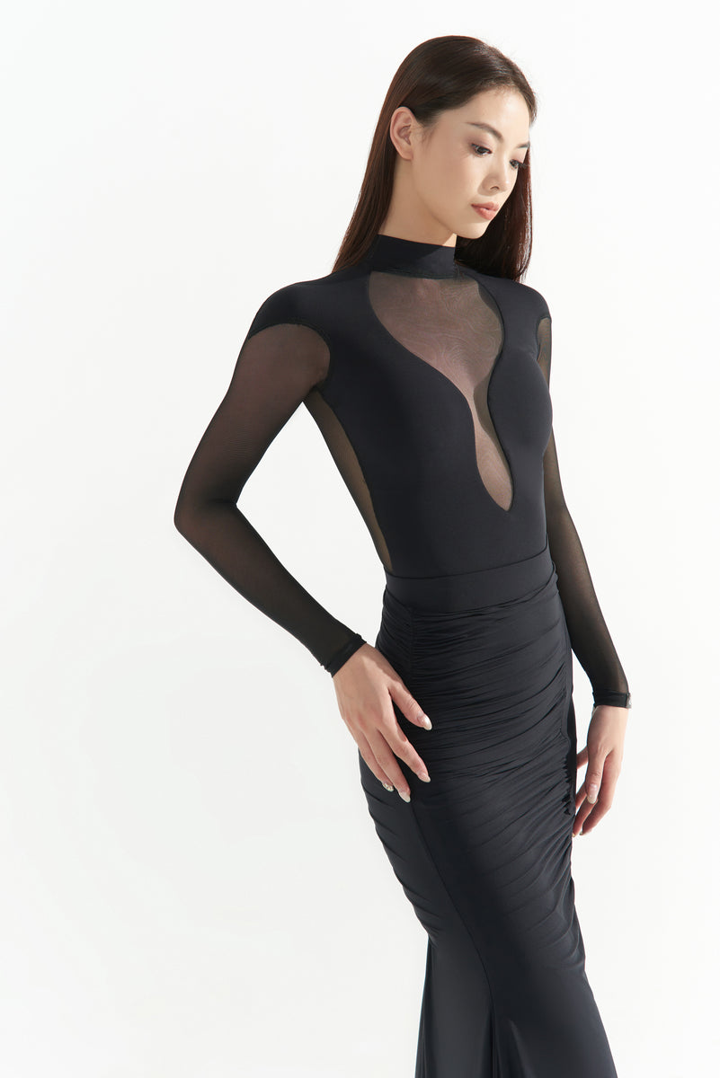 The DANCE QUEEN 1060 combines technical precision with elegant design for serious ballroom dancers. This black leotard features a distinctive high neck and strategic mesh paneling that enhances breathability during intensive practice sessions. The construction supports proper posture and movement alignment essential for ballroom technique development. Crafted for durability through repetitive training, the fabric maintains its shape and color integrity. The sleek silhouette provides the clean lines ballroom choreography demands while allowing unrestricted range of motion. Ideal for rehearsals, competitions, and dedicated dancers seeking professional-grade practice wear.