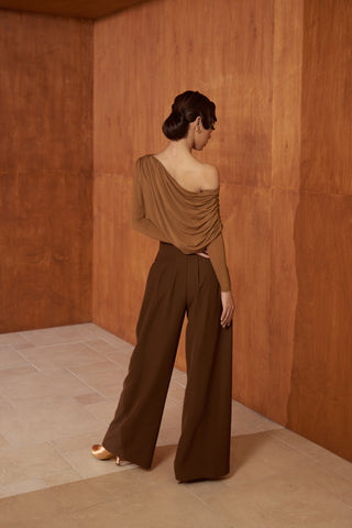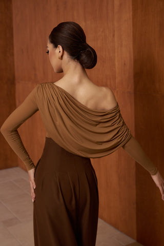 The DANCE QUEEN 821-4 ballroom leotard exudes understated elegance with its sand-colored fabric and off-shoulder neckline. Designed with long sleeves that provide graceful coverage, this piece offers both comfort and a refined silhouette. Perfectly tailored to enhance your movements, it is an exquisite choice for dancers seeking sophistication and timeless style on the dance floor.