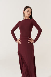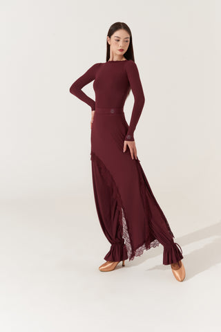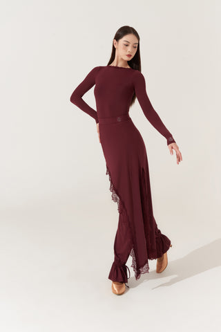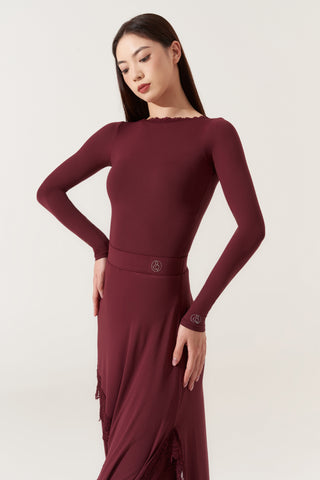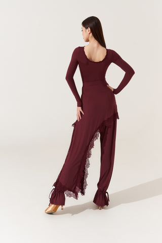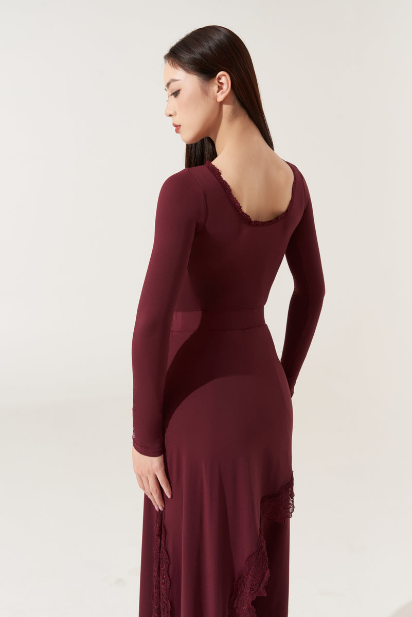 Elevate your ballroom practice with this exquisite wine-stained red leotard, featuring delicate lace detailing and long sleeves for refined elegance. Designed specifically for serious dancers, this limited-edition piece combines sophisticated aesthetics with functional sportswear construction. The luxurious lace accents enhance your silhouette while maintaining the freedom of movement essential for mastering complex choreography. Perfect for practising, this leotard delivers both style and substance. Available now at 20% off for a limited time only.