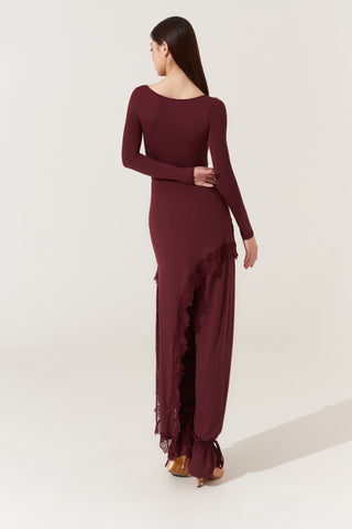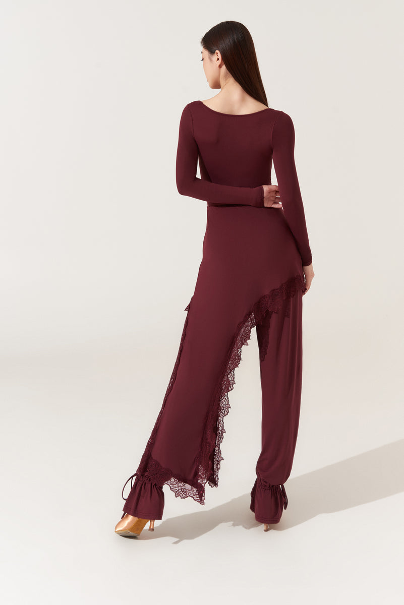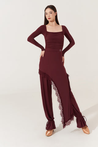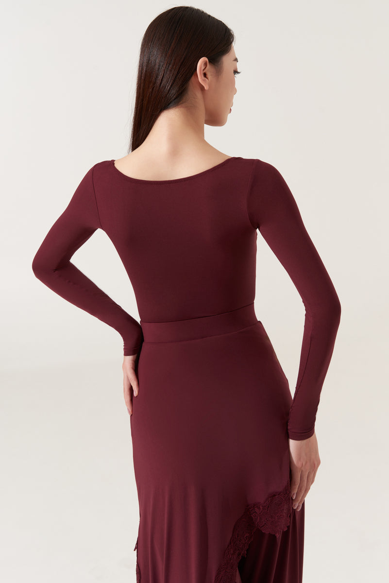 DANCE QUEEN 1085 Wine-Stained Red Ruffle Long Sleeve Ballroom Practice Dance Sport Leotard - S