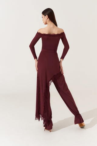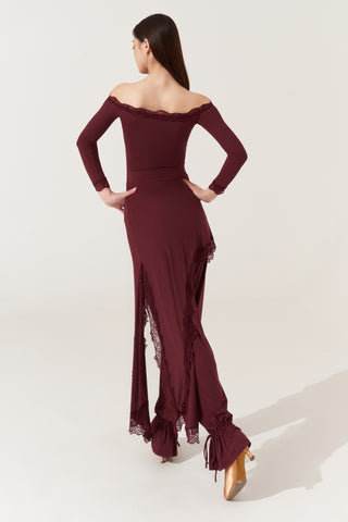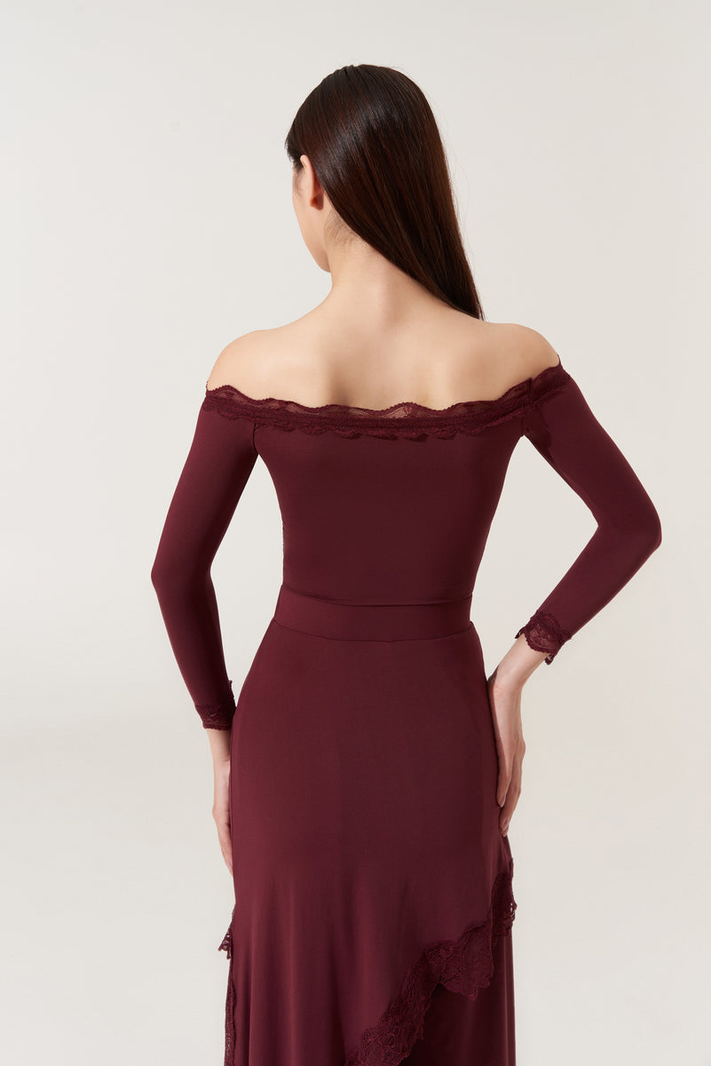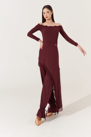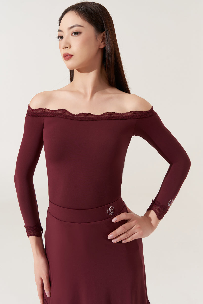 DANCE QUEEN 893-3 Wine-Stained Red Off Shoulder Flower Ballroom Practice Dance Sport Leotard - S