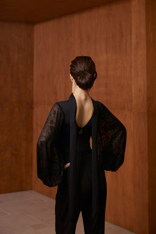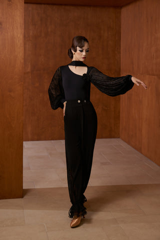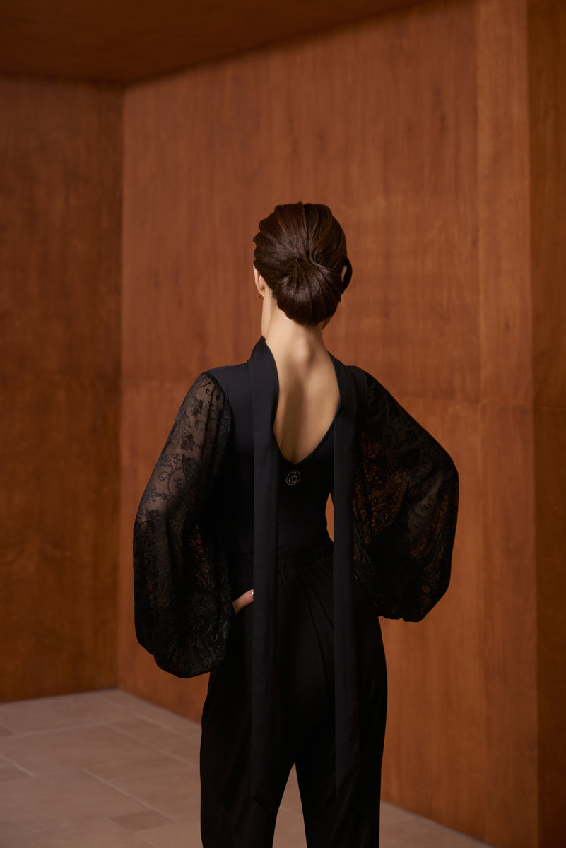 DANCE QUEEN 808-5 Black Hollow Flower Lantern Lace Sleeve Dancing Ballroom Leotard Распродажа