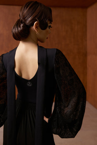 DANCE QUEEN 808-5 Black Hollow Flower Lantern Lace Sleeve Dancing Ballroom Leotard - 2XL