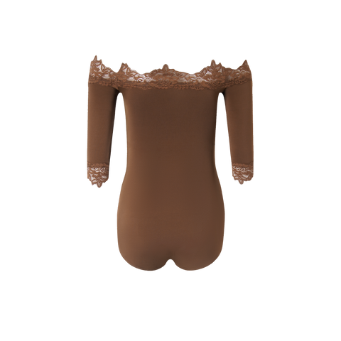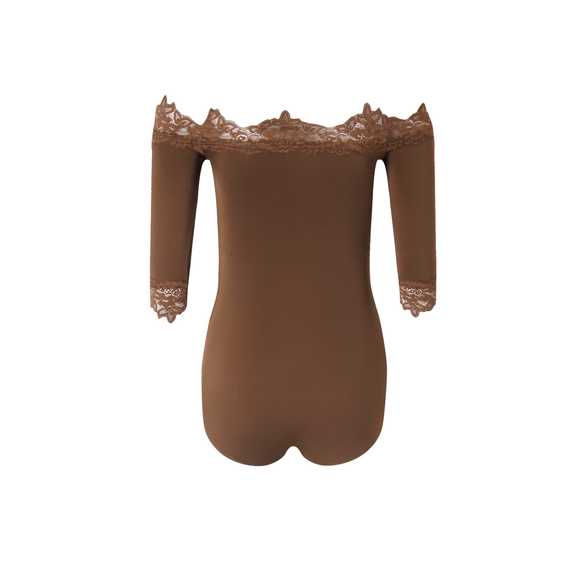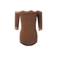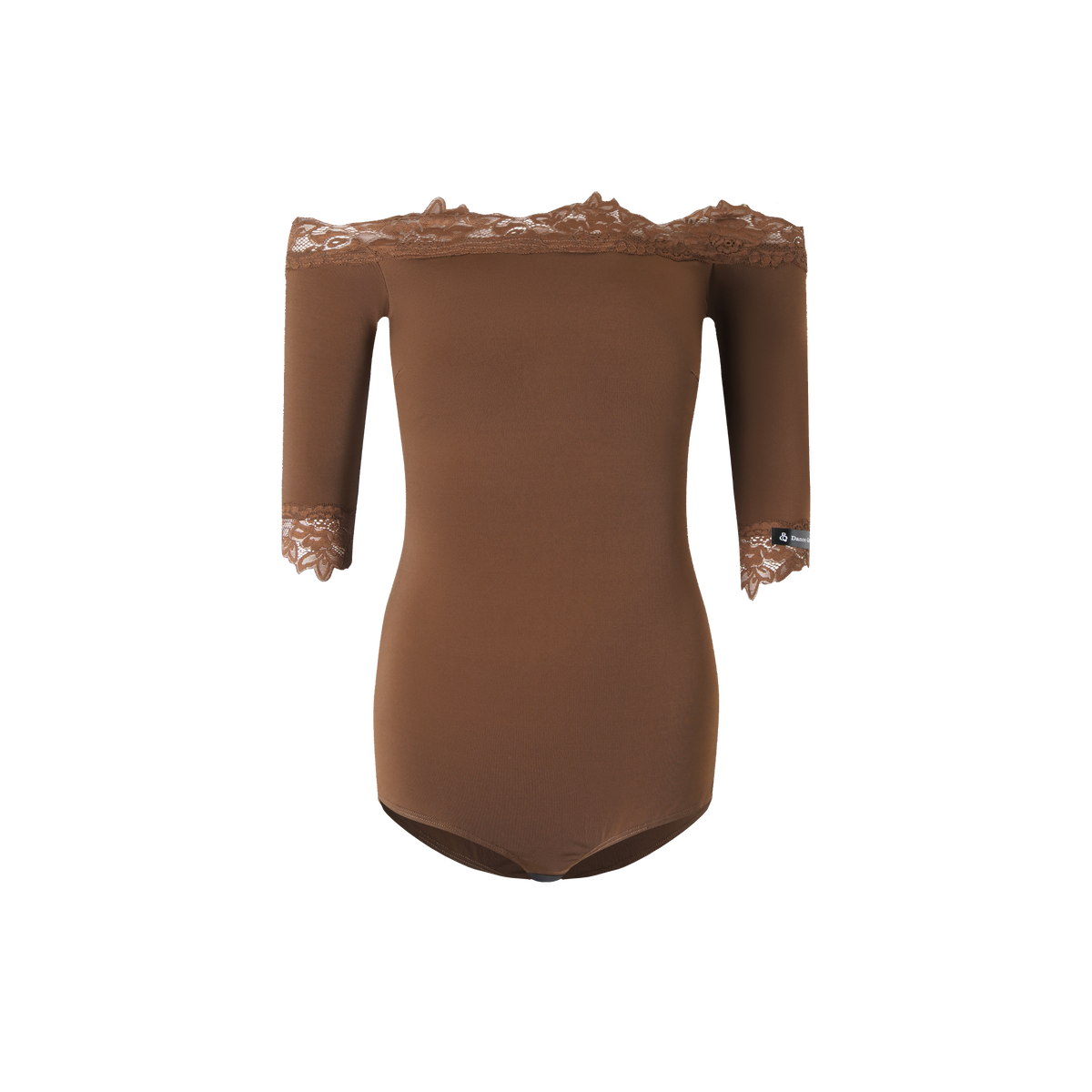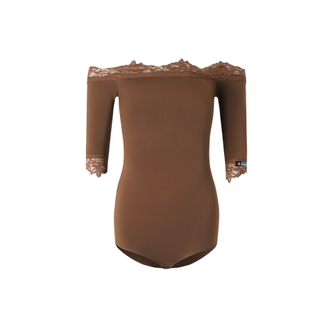 The DANCE QUEEN 943-9 Brown Lace Off Shoulder Ballroom Practice Dance Sport Leotard combines refined aesthetics with functional design. Featuring intricate brown lace and an elegant off-shoulder style, it enhances your dance movements while maintaining a polished, sophisticated look. Perfect for dancers seeking grace and comfort during their practice sessions.